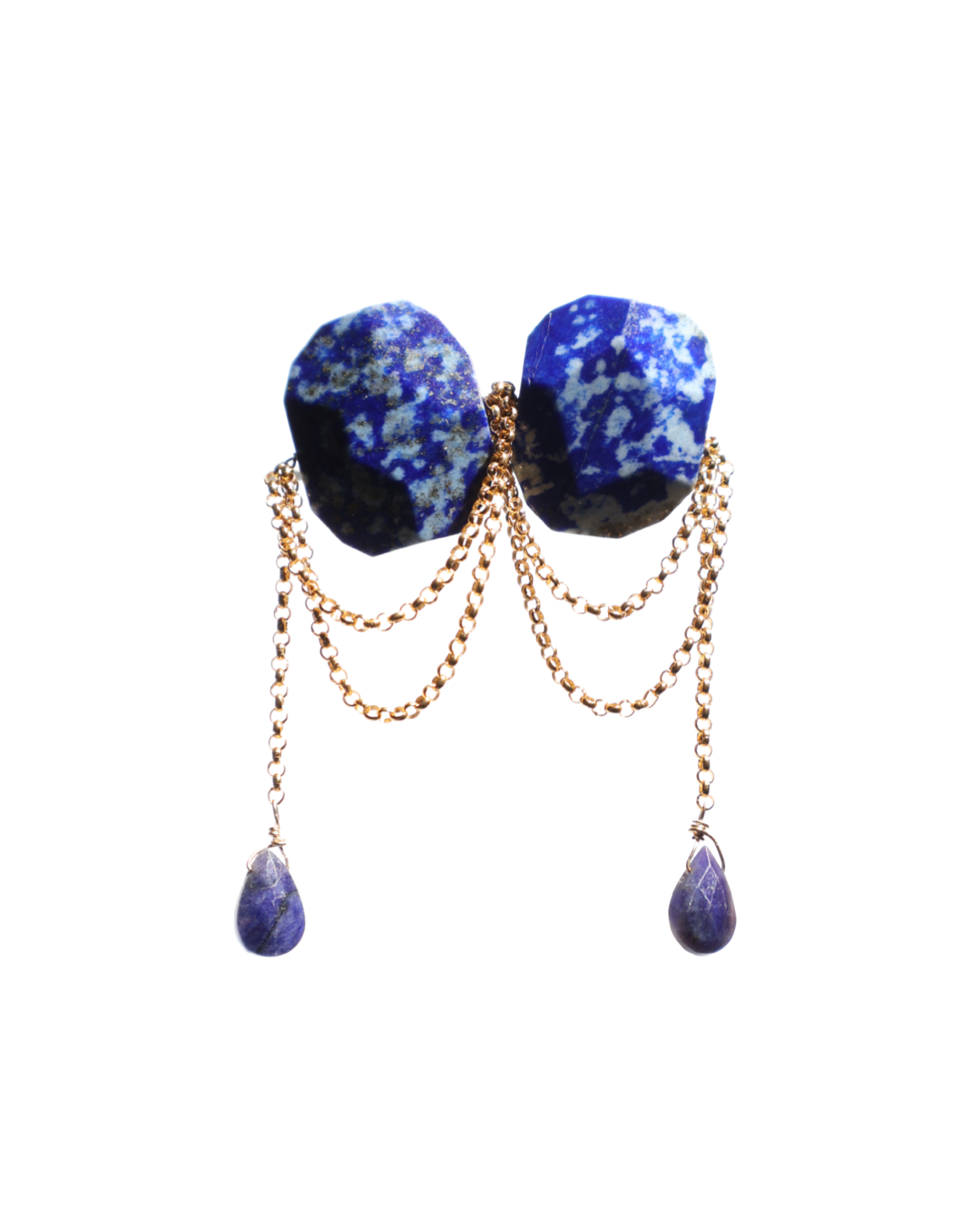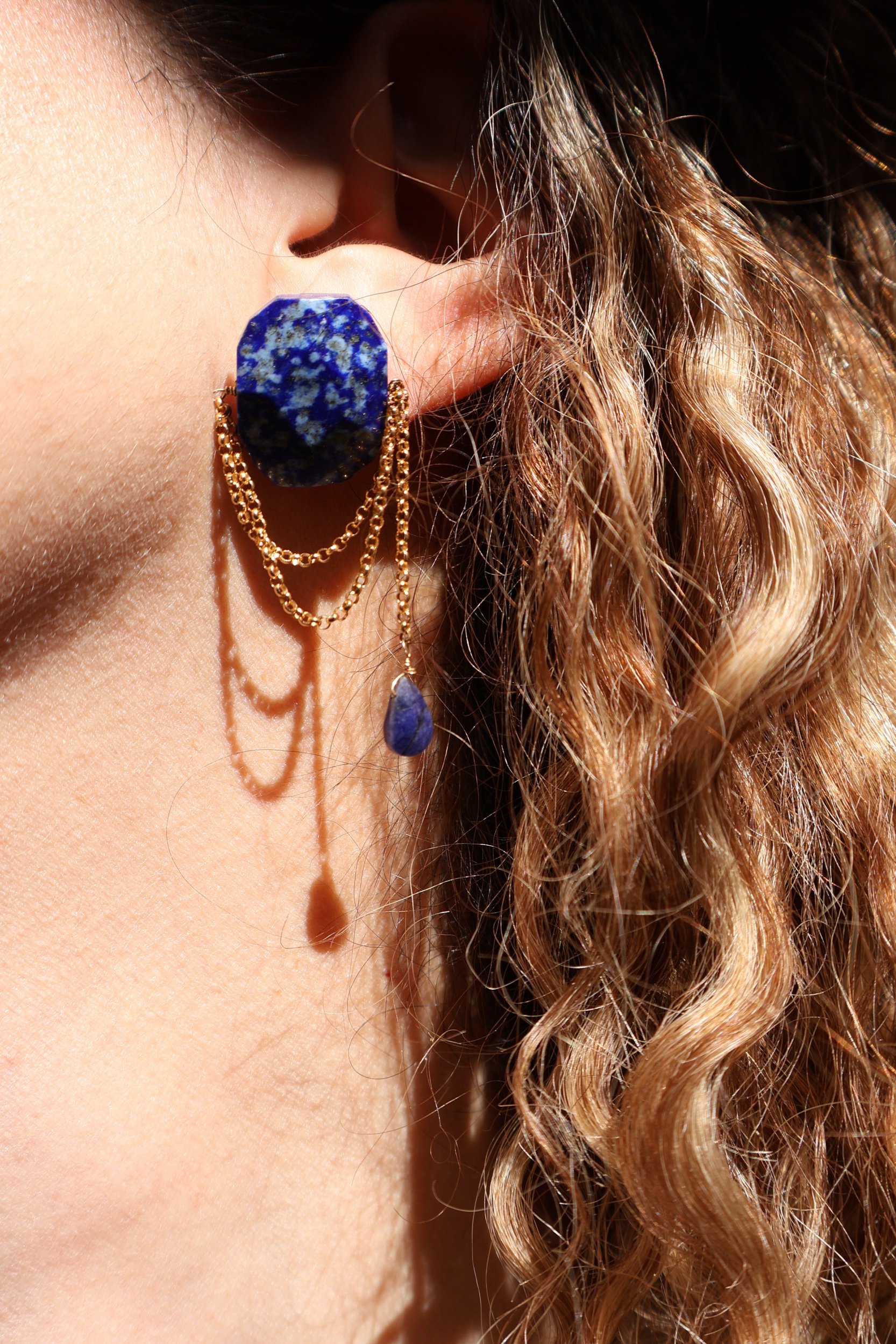 Deep blue lapis lazuli earrings with delicate draped 14K gold-filled chains and small lapis drops. The rich royal blue tones paired with the soft movement of the chains create a bold yet elegant statement. Each pair is handmade and one of a kind due to the natural patterns of the stones.